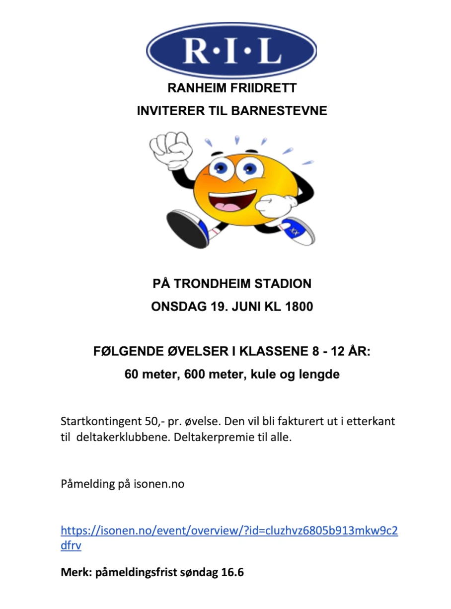 Velkommen til Barnestevne onsdag 19. juni på Trondheim Stadion.
